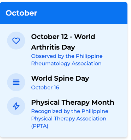 Take charge of your musculoskeletal health by staying informed about key health observances recognized in the Philippines.This annual calendar features nationally proclaimed awareness weeks, global health campaigns, and local professional events that focus on bone, joint, spine, and physical therapy care.
